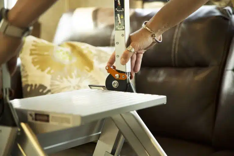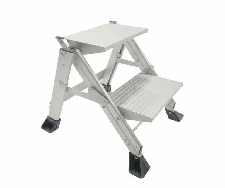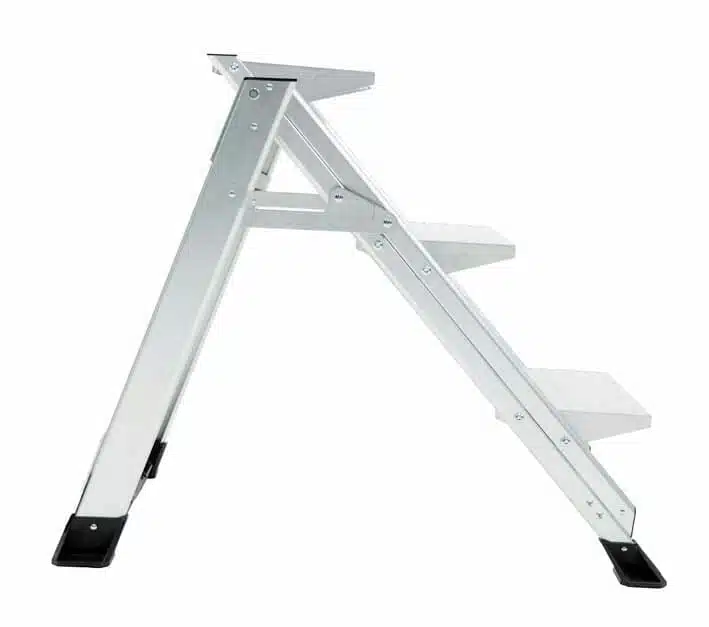 " Pure quality - I bought the 2 step ladder. I am 74 years old and don't want a cheap stepping ladder. The steps are large and as you can see the bottom feet have stabilizers on them. "