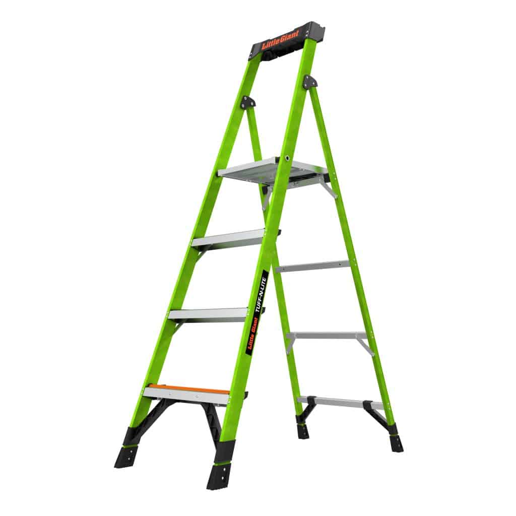 The Tuff-N-Lite is noticeably lighter than most fibreglass stepladders. Secondly, the platform design eliminates the user standing on the top rung. The Tuff-N-Lite incorporates Little Giants newest feature called the Ground Cue, which notifies the operator when they are on the bottom rung.