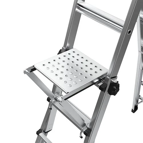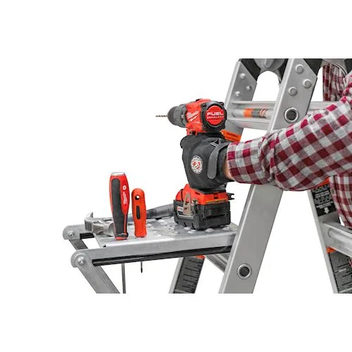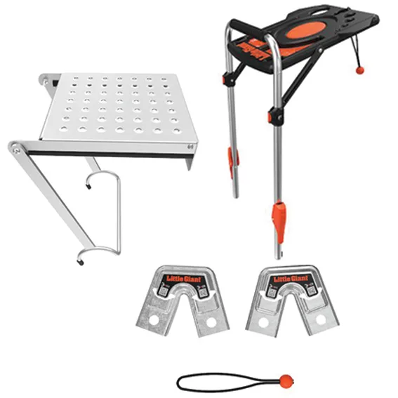 The Little Giant Work Platform fits on any rung and is rated to support 180kgs. Its primary use is to act as a wide platform to stand on which reduces foot and leg fatigue when standing on rungs for an extended period of time. Simply place on any rung and slide platform back to deploy and kick back in to tuck away safely. The Work Platform stores inside your ladder by placing the lip on one of the rungs so your platform always travels with you. Buy a second platform to use as a paint & tool tray.